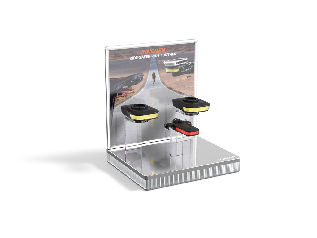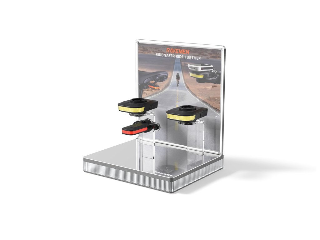 Kompaktní stolní display pro vystavení předních světel FR160, FR300 a FR500 a zadního světla CL01.