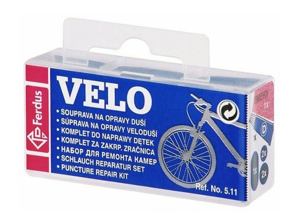 universální souprava lepení, 5× záplata (1× 50×25 mm, 2× pr. 20 mm, 2× pr. 25 mm), 1× lepidlo, 1× smirek
