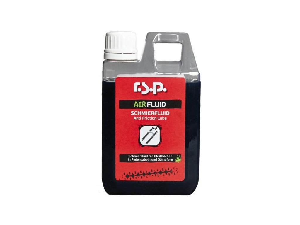 RSP Air Fluid je speciální mazivo pro mazání kluzných povrchů a kluzných ložisek odpružených vidlic a tlumičů. Použitelné do vzduchových komor k mazání vzduchových těsnění proti zaseknutí tlumiče/vidlice. Snižuje tření a chrání těsnění proti opotřebení. Vzhledem k přidaným aditivům je Air Fluid extrémně dlouho použitelný bez potřeby výměny, má antikorozní účinky a na jeho viskozitu nepůsobí vnější teplota.